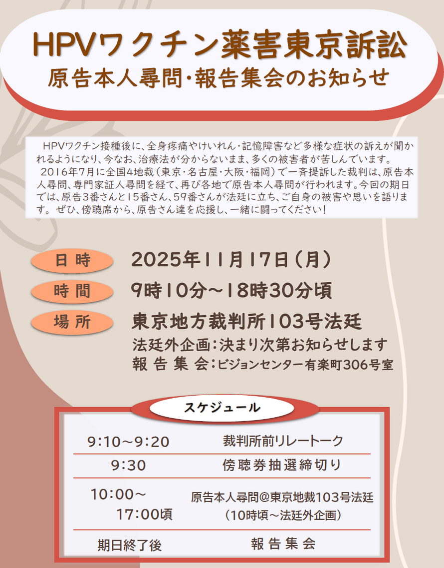 2025年11月17日(月)午前10時より、東京地方裁判所103号法廷において、HPVワクチン薬害東京訴訟・原告本人尋問が行われます。